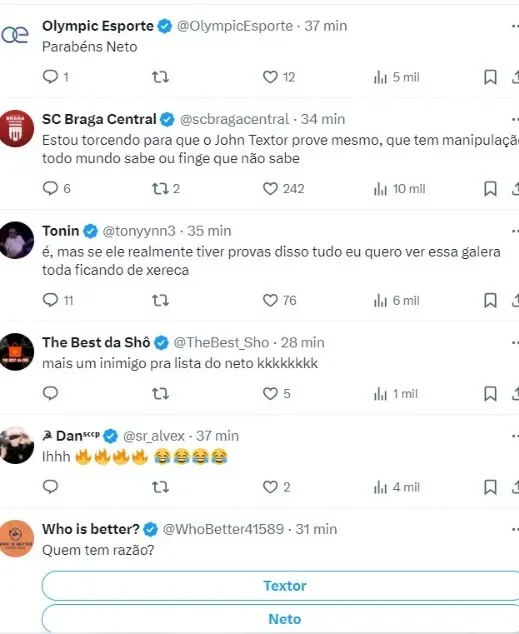 O ex-jogador e apresentador do programa Os Donos da Bola, da TV Bandeirantes, Neto chamou Textor de Babaca e disse que se a CBF fosse justa e séria, o Botafogo estaria fora do Brasileirão.