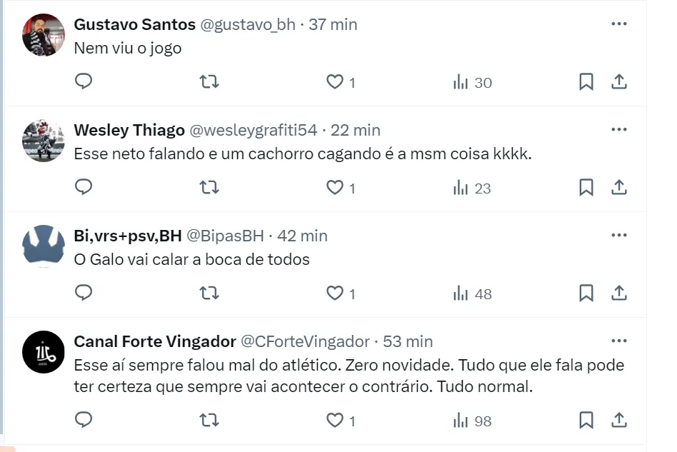 Nas redes sociais, o apresentador Neto criticou o time do Atlético-MG e afirmou que o Alvinegro de Belo Horizonte sempre pipoca para o rival. Com isso, o ex-jogador acredita que a equipe da Toca da Raposa será campeão.