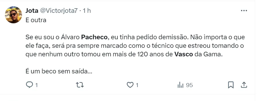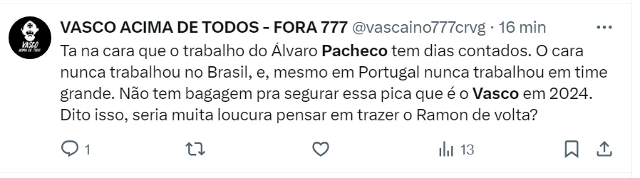 Álvaro Pacheco, que estreou contra o Flamengo, pediu desculpas ao torcedor vascaíno após a derrota humilhante no clássico. O comandante português tem contrato até o fim do ano.