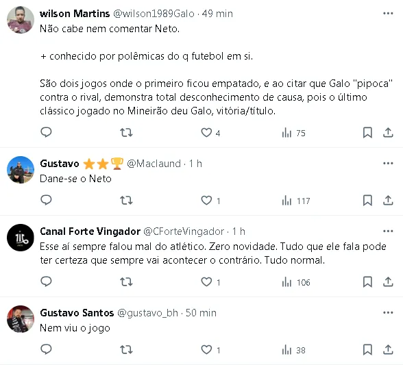 Apesar de reconhecer o talento do jogador Hulk, considerando-o um atleta extraordinário, Neto ressaltou que, na sua percepção, o Atléticopipoca” diante do Cruzeiro.