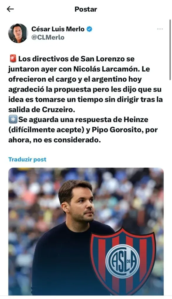 Segundo informações do jornalista César Luis Merlo, especialista no mercado argentino, o San Lorenzo fez uma oferta ao ex-cruzeirense. No entanto, ele agradeceu, mas recusou a proposta para ser o novo técnico da equipe.
