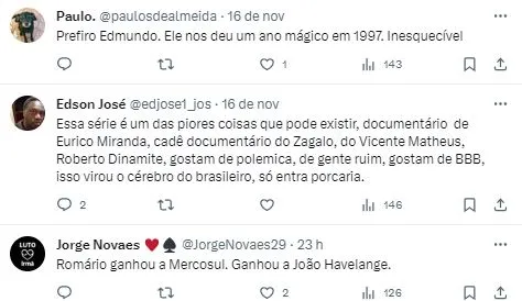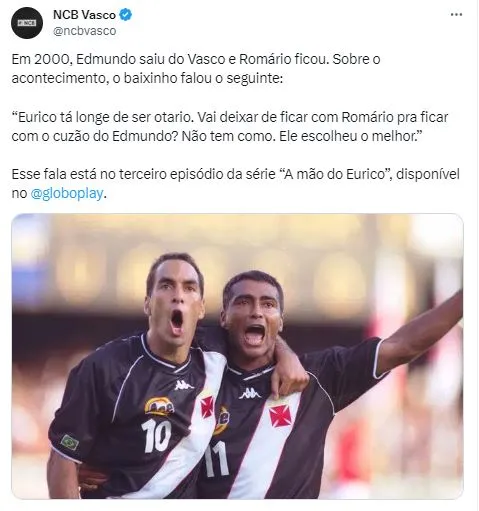 Contudo, em matéria que também foi publicada pelo Globo Esporte, Edmundo abriu coração para se posicionar sobre a situação: “Eu não quis falar no documentário. Tenho muito carinho pelo doutor Eurico, muito carinho mesmo. Ele faleceu sem a gente se falar”. Iniciou.