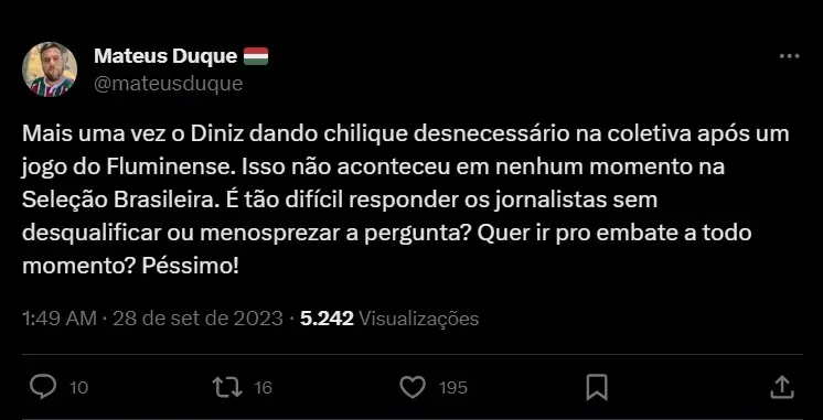 A postura de Fernando Diniz vem sendo criticada nas redes sociais, já que o torcedor questionou a postura do profissional. Isso porque, ao comparar, destacou que isso não acontece quando se trata da Seleção. “Mais uma vez o Diniz dando chilique desnecessário na coletiva após um jogo do Fluminense. Isso não aconteceu em nenhum momento na Seleção Brasileira. É tão difícil responder os jornalistas sem desqualificar ou menosprezar a pergunta? Quer ir pro embate a todo momento? Péssimo!”, destacou.