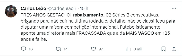 Vale destacar que o Vasco disputou a última temporada, 2022, na Série B, mas a expectativa era que com a chegada da 777 Partners, que adquiriu a equipe através da SAF, as coisas evoluíssem. Entretanto, a situação acabou não correndo como o esperado.