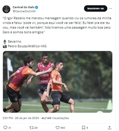 Em entrevista nesta sexta-feira (26), Savarino revelou que Igor Rabello o aconselhou fechar com o time. O zagueiro antes de vestir a camisa do Galo, também passou pelo time do Rio de Janeiro.