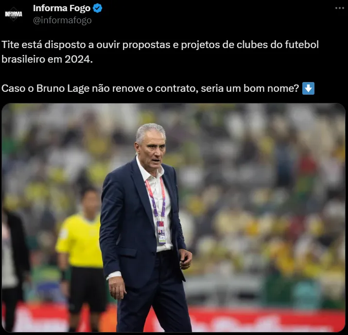 O ex´treinador da Seleção Brasileira Tite, está disposto a voltar a comandar um clube no país. Com isso, as redes sociais já estão malucas, com alguns pedidos que ele assuma o projeto do Botafogo no próximo ano. “Se vier, é o técnico campeão da Libertadores 2024 pelo Botafogo de forma invicta”, “sim!!! pra assumir amanha se possivel” e “Tem um estilo de jogo que combina com esse elenco, independente do resultado final do Brasileirão, já deveriam falar com Ele.”
