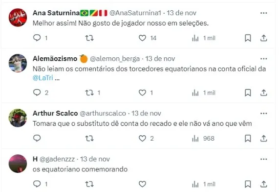 O jogador do Internacional, vale lembrar, foi cortado da seleção equatoriana durante a Data FIFA após um desconforto na coxa. O atleta sentiu dores na derrota por 3 a 0 para o Palmeiras.