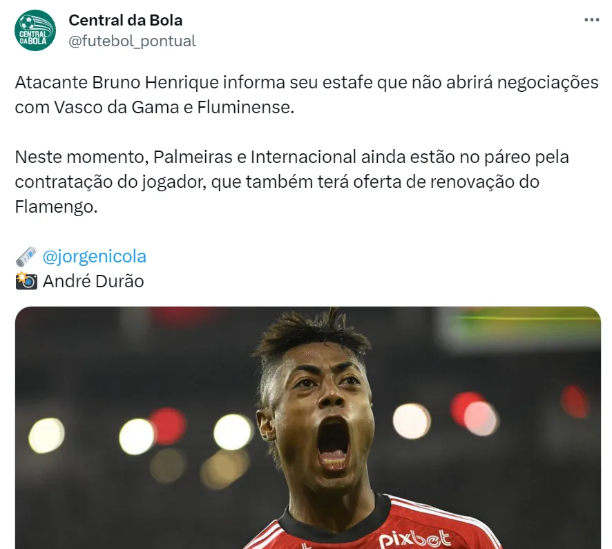 “O Bruno Henrique já pediu para Denis Ricardo, que é seu representante, que não negocie com Fluminense e Vasco. Bruno Henrique tem enorme respeito e carinho pelo Flamengo, ele vai dar prioridade de continuar no Flamengo. Se não rolar de continuar no Flamengo, ele não vai trocar o Flamengo por um rival da cidade Rio de Janeiro. Por respeito ao Flamengo, ao torcedor, mas também por preocupação em relação à sua família”, disse Nicola em seu canal no Youtube.