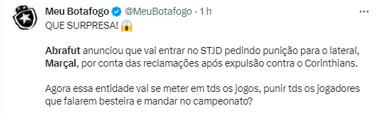 Vale lembrar que a Abrafut vem aparecendo bastante ao repudiar atitudes de botafoguenses. No jogo contra o Atlético-MG havia também publicado uma nota de repúdio contra o treinador português Bruno Lage e o atacante Diego Costa que haviam reclamado de um gol marcado pelo Time de General Severiano que acabou anulado. O STJD ainda não se manifestou a respeito.