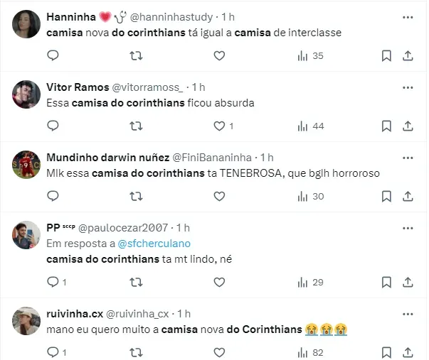 A camisa agradou alguns torcedores corintianos, mas a maioria das opiniões reprovaram o uniforme de 2024/2025 do Timão. Veja as opiniões nas redes sociais: