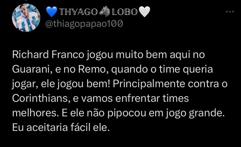 Quem deixou o clube este ano foi Richard Franco, o paraguaio disputou 25 partidas, com cinco gols marcados, o último deles na 15ª rodada da Série C deste ano, contra o Ypiranga-RS. Já a sua última partida com a camisa azulina foi contra o CSA, na melancólica despedida remista da Série C, no dia 20 de agosto. Desde então o atleta estava ausente dos gramados.