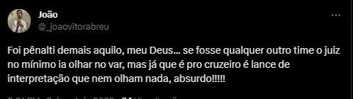 No confronto entre o Bragantino e o Cruzeiro pela 22ª rodada da Série A do Campeonato Brasileiro, jogadores do Bragantino expressaram frustração devido a duas possíveis situações de pênalti no final da partida. A primeira reclamação envolveu um toque de mão de Wesley após um cruzamento.