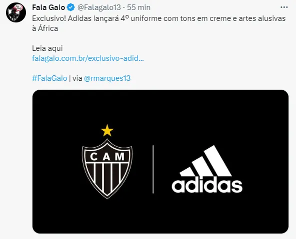 Bastidores do lançamento do 4º uniforme do Galo foram divulgados neste sábado (14) pelo portal Fala Galo. A camisa, que será fabricada pela fornecedora de materiais esportivos do Atlético, a Adidas, terá como foco o mês da consciência negra e será estendida aos outros clubes que possuem a assinatura da multinacional alemã nos seus vestuários. O lançamento está previsto para o início de novembro.