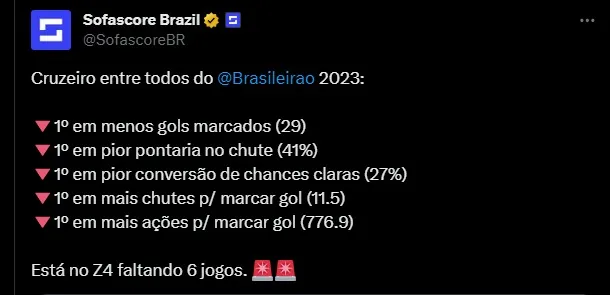O Cruzeiro encontra-se na zona de rebaixamento, somando 37 pontos em 32 jogos disputados.