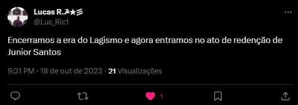 “Encerramos a era do Lagismo e agora entramos no ato de redenção de Junior Santos”, “Nunca critiquei o Júnior Santos”, “Os botafoguenses já fizeram fila pra pedir desculpas ao Júnior Santos?” e “Júnior Santos: é grosso, mas tem qualidade. Com pouco holofote, apareceu no momento crucial para o Botafogo continuar a caminhada ao título”, foram alguns dos comentários dos torcedores do Botafogo.