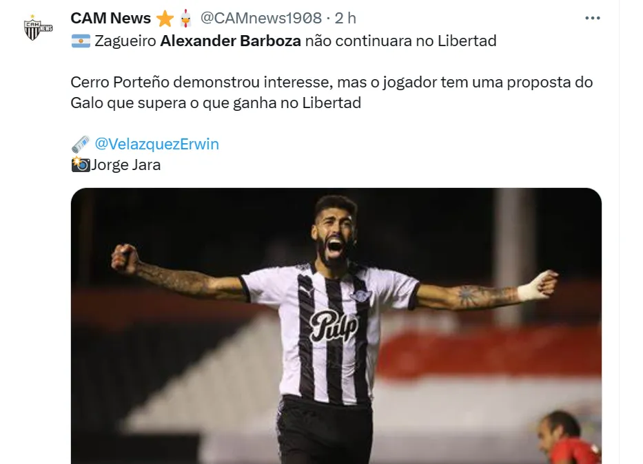 Com a aposentadoria do ídolo Réver, há a necessidade de um zagueiro de confiança a mais no elenco. O jornalista Erwin Velazquez, da Rádio 1120 AM, do Paraguai, informa que Alexander Barboza, número 3 do Libertad, está em negociações com o Galo.