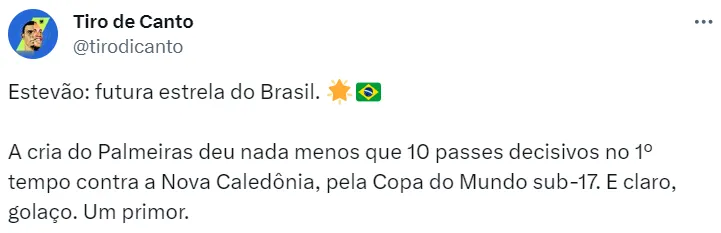 “Estevão, mais conhecido como ‘Messinho’, liderou a Canarinho na vitória por 9 a 0 sobre a Nova Caledônia. O jovem do Palmeiras marcou um golaço e distribuiu três assistências”, apontou a matéria.