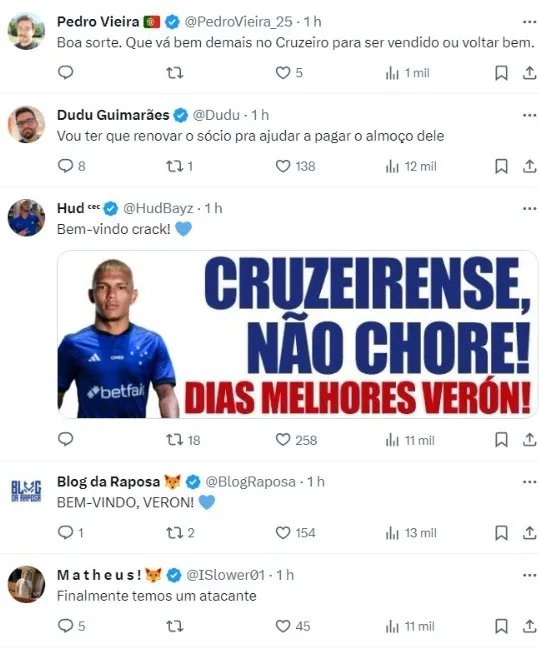 Além de Gabriel Verón, o Cruzeiro também anunciou outros dois reforços: Rafa Silva e o técnico Nicolás Larcamon. A tendência é que até os primeiros dias de janeiro a Raposa siga anunciando novos nomes.