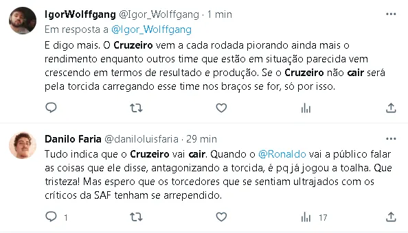 O único triunfo nesse período aconteceu na estreia do técnico Zé Ricardo, com uma vitória por 3 a 0 sobre o Santos, na Vila Belmiro. No entanto, as dificuldades continuaram, e a equipe viu a sua distância para a zona de rebaixamento diminuir. Nas últimas rodadas, a diferença aumentou apenas entre a 21ª e a 22ª rodada. Atualmente, o Cruzeiro ocupa a 15ª colocação na tabela do Brasileirão, e sua posição está ameaçada, com a possibilidade de perder até três posições no próximo jogo, um clássico contra o Atlético-MG.