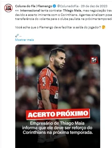 Com contrato até 2026, Thiago Maia é jogador do Flamengo, porém, ele desperta interesse do Internacional. O jogador está na mira do Corinthians também para reforçar na temporada.