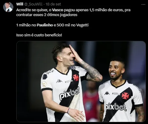 Apresentado em julho, Paulinho foi adquirido pelo Vasco por 1,2 milhão de Euros, cerca de R$ 6,5 milhões, com contrato válido até dezembro de 2025. Após o importante triunfo sobre o América-MG, o Vasco se prepara para um confronto crucial contra o Santos, visando manter sua luta pela permanência na Série A.