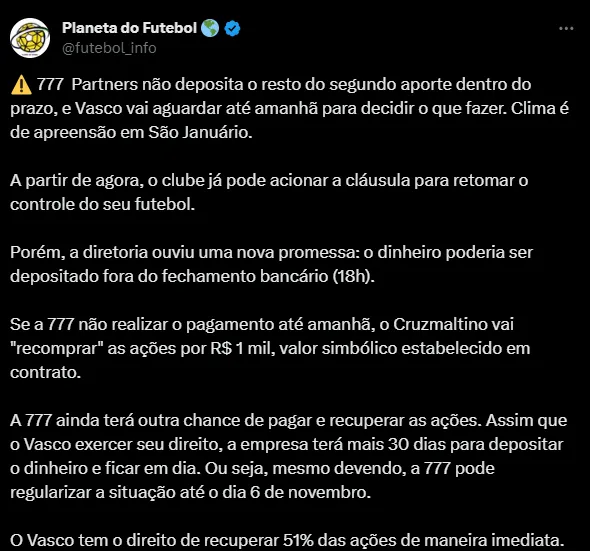 Ou seja, o Vasco vai esperar até esta sexta-feira (6), para ver o dinheiro em caixa. Se a 777 continuar inadimplente, o Cruzmaltino deve exercer a cláusula de recompra das ações do futebol. Vale destacar que, se o Vasco realizar essa atitude, a empresa ainda tem mais 30 dias para quitar o valor. Caso não faça até o início de novembro, a equipe de São Januário está autorizada a captar novos investidores. Resta saber quais serão os próximos capítulos desta novela.