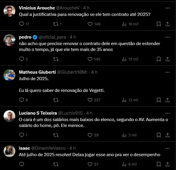 Nas redes sociais, alguns vascaínos comentaram sobre o tópico envolvendo Vegetti: “Com todo respeito ao Vegetti, mas ele já tem uma idade avançada para renovar por mais 2/3 anos e ainda com um aumento salarial, ele tem que provar nessa temporada que ainda pode dar frutos ao clube“.
