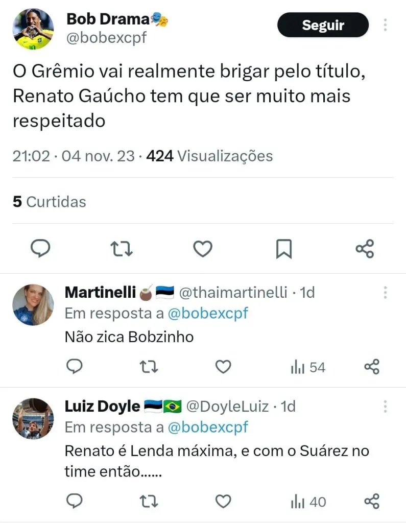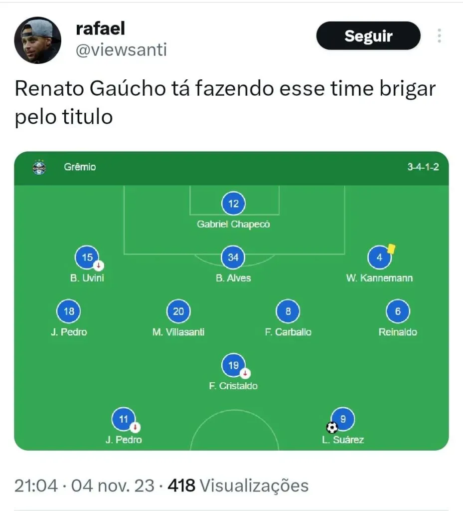 O alvinegro carioca tem dois jogos a menos, todavia Renato Gaúcho acredita que o Tricolor está na briga pelo título do Campeonato Brasileiro. “Lógico que eu acredito (no título), hoje estamos a três pontos do Botafogo, sei que o Botafogo tem jogos a menos, mas ele precisa ganhar.”, iniciou o treinador.