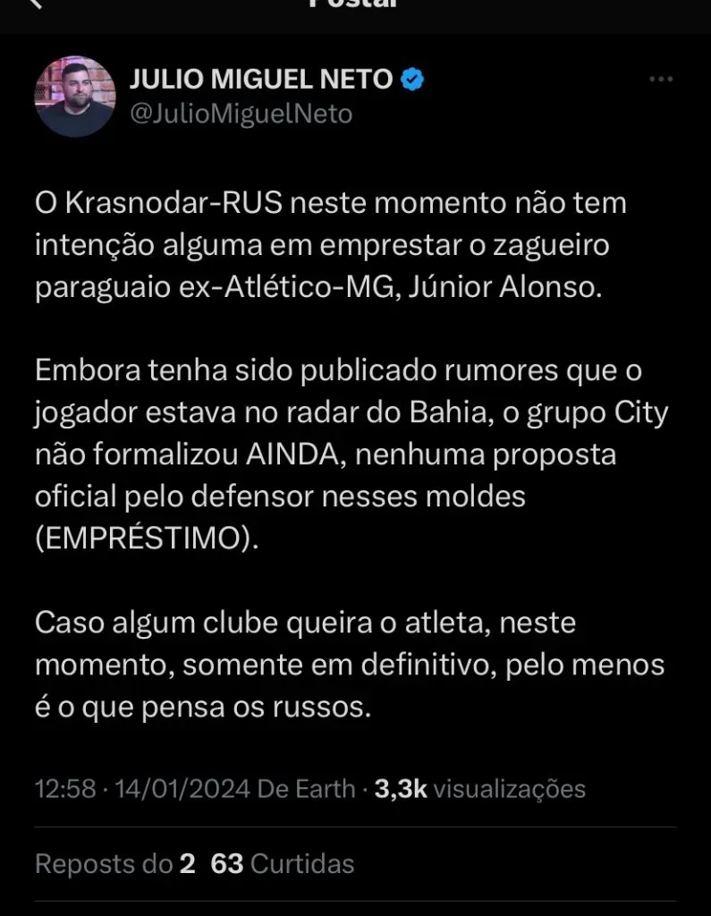 Neste domingo (14), o jornalista Júlio Miguel Neto informou que o time russo não tem intenção alguma de emprestar o zagueiro de 30 anos. O Bahia demonstrou interesse no atleta recentemente.