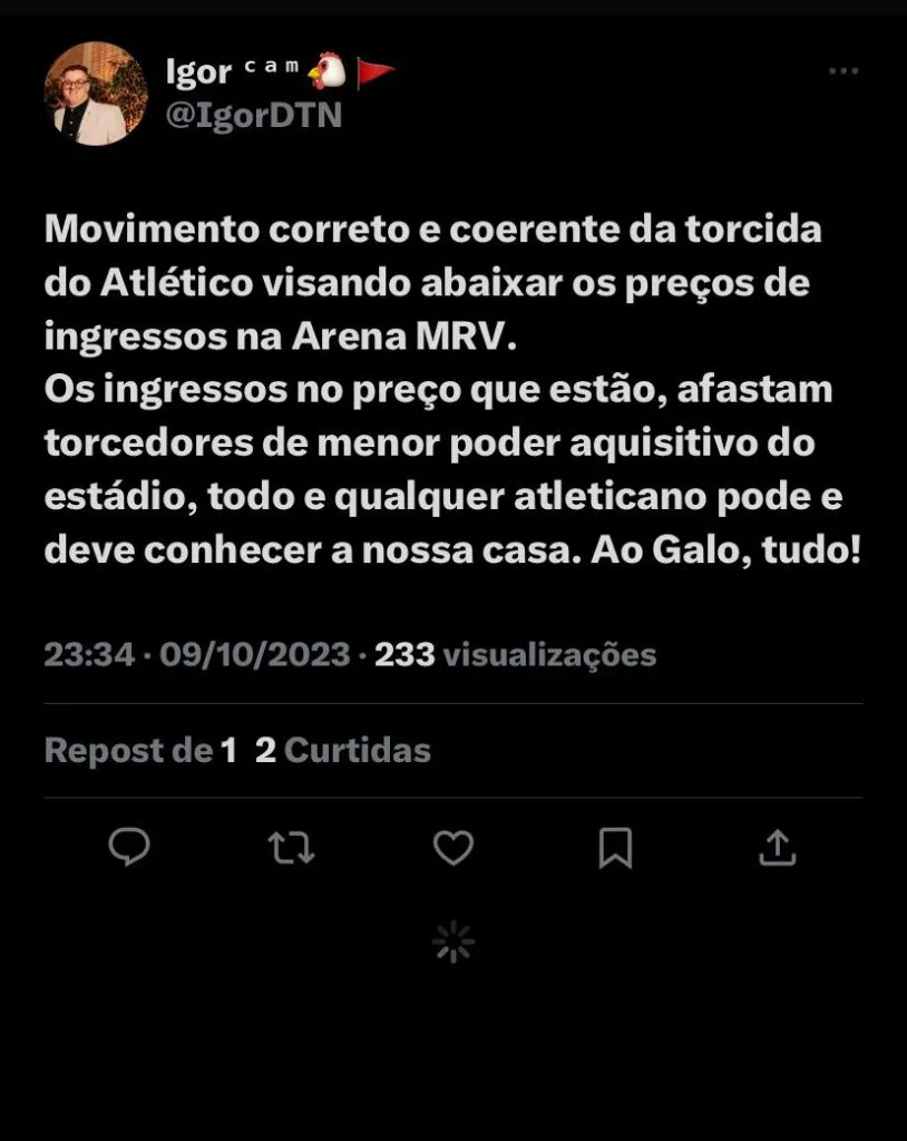 De fato, o futebol a cada dia que se passa deixa de ser do povo, infelizmente o Atlético que se diz prezar tanto pelo ‘povo’, pela Massa, pela torcida, também segue o mesmo padrão. Falamos aqui da Arena MRV, mas isso é visto em muitos clubes do Brasil e pelo mundo, os preços elevados em relação ao futebol vem deixando as arquibancadas cada vez mais frias.