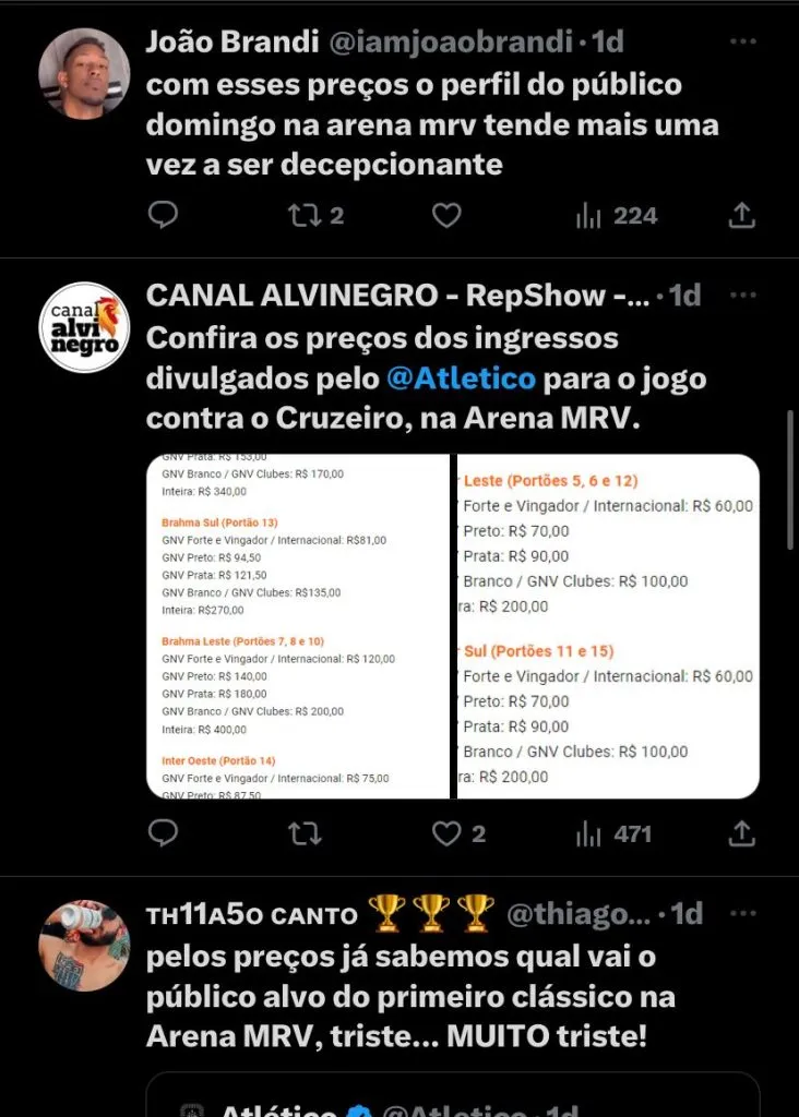 Para o Atlético que tem uma torcida apaixonada, apesar das reclamações tem uma parte que se faz presente, mas não dá para negar que diante dos preços elevados muita gente é afastado do futebol, da paixão, de ver de perto os seus ídolos, ao meu ver, infelizmente isso vem se tornando cada dia mais ‘banal’ para nossa sociedade que acompanha e ama o futebol.