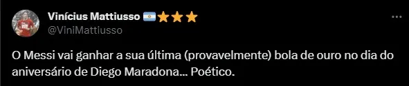 O maior e mais querido argentino da história. Para Messi será uma honra ter ganho a Copa após o Maradona ter deixado a gente em 2021, e também conquistado a Copa do Mundo com a brilhante camisa 10 argentina. O esporte escreve histórias incríveis para craques inimagináveis e hoje Messi fará mais um capítulo disso. Vence o Futebol de novo.