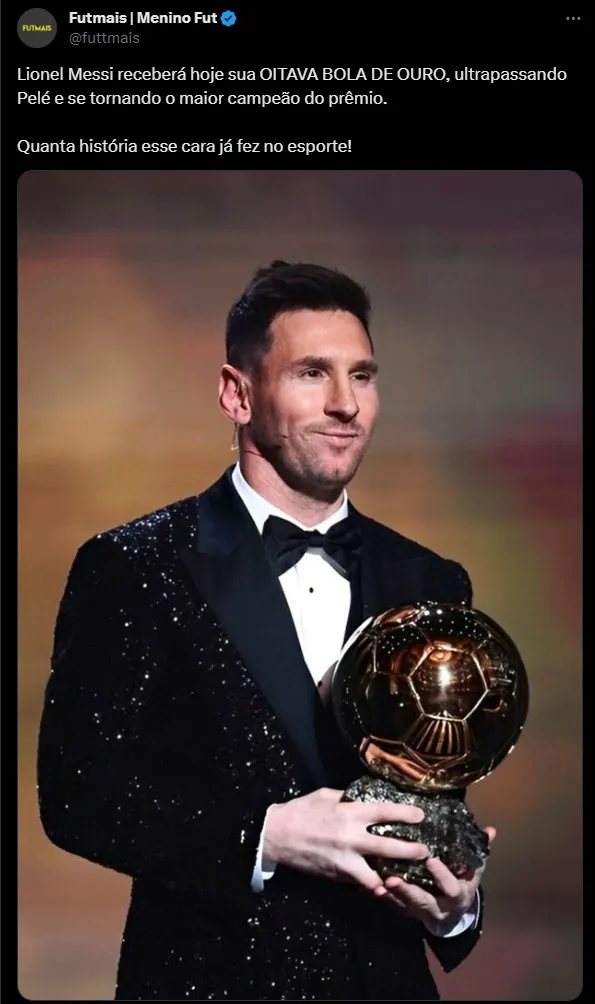 Se eleito melhor jogador, Messi coroará o brilhante Mundial que fez no Catar, quando marcou gols em todas as fases decisivas do torneio, levando a Argentina para a final e sendo campeão do Mundo. Título que seu país não vencia desde 1986.