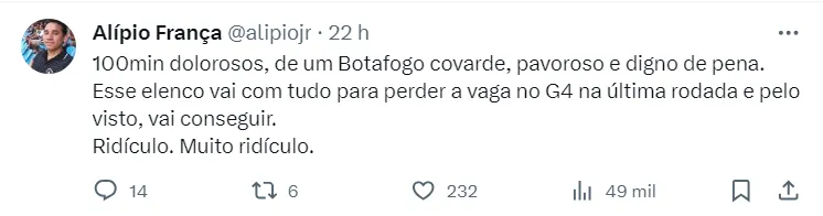 Hoje o Botafogo é quinto colocado do Campeonato Brasileiro, ou seja, não tem vaga direta na fase de grupo da Libertadores de 2024, e caso fiquei ao fim do Campeonato entre a quinta e a sexta posição, terá que disputar a pré-libertadores.
