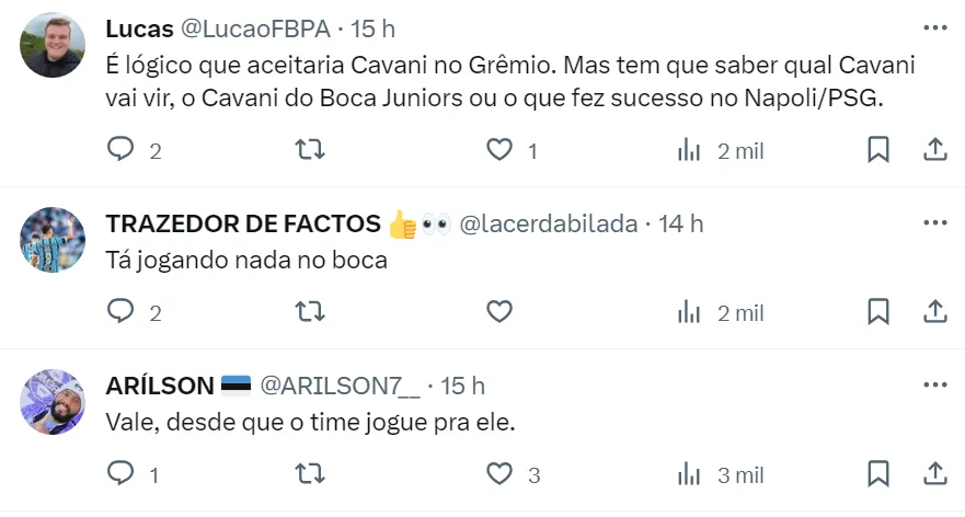 Nas redes sociais, os torcedores gremistas se dividem sobre a possibilidade de contar com o atacante. No entanto, não dá para dispensar um jogador do histórico de Cavani. O Grêmio deveria tentar essa contratação.