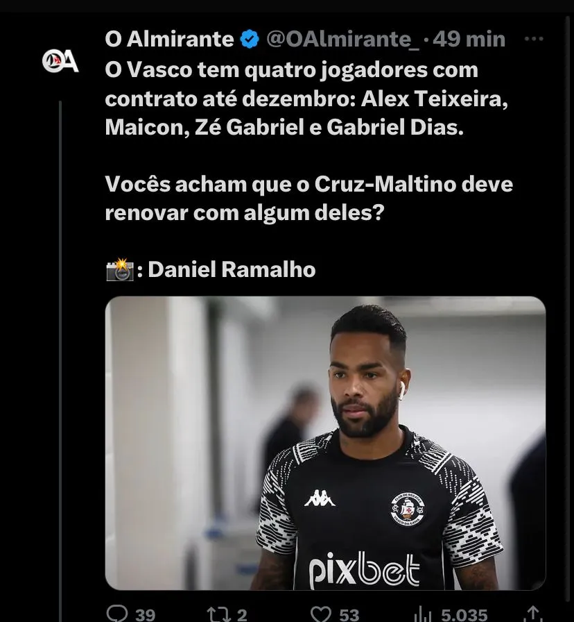 Na 17ª colocação, a vitória se faz mais que necessária na luta contra mais um rebaixamento, com isso, a equipe vem se preparando fortemente. No meio dessa preparação, diante do final da temporada, relembraremos alguns jogadores que estão em final de contrato: Zé Gabriel, Alex Teixeira, Maicon e Gabriel Dias. Começando pelo Zé Gabriel teve pouco desde que chegou, mas com a chegada de Ramón Díaz ao Vasco, ele vem ganhando espaço no time, vem sendo titular e tudo mais. Bom, na opinião da torcida, ele não tem que permanecer, porém, ao meu ver, talvez ele seja um jogador que possa agregar ao elenco em 2024.