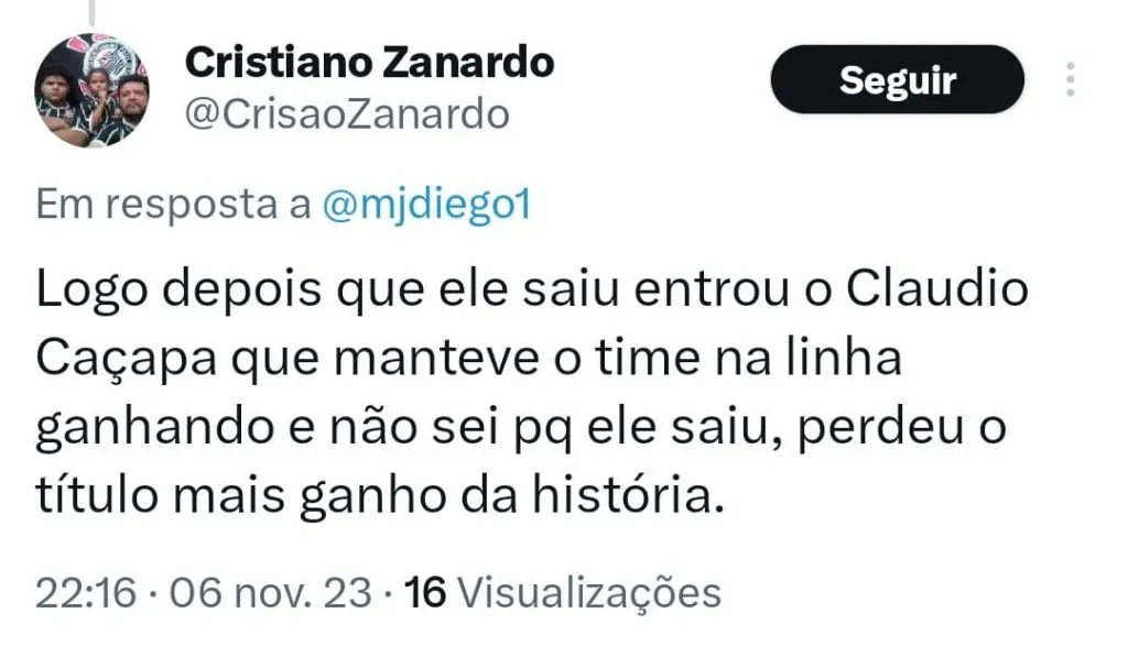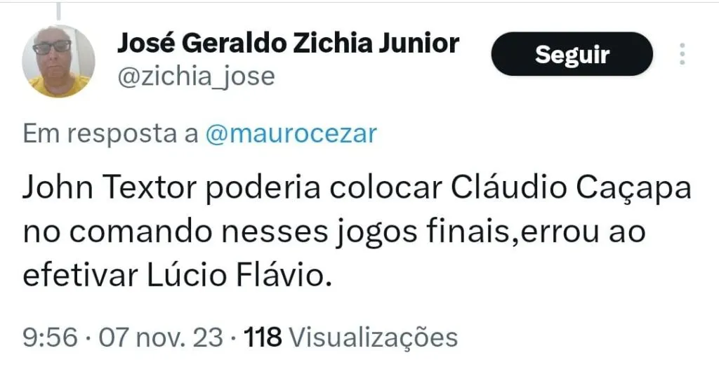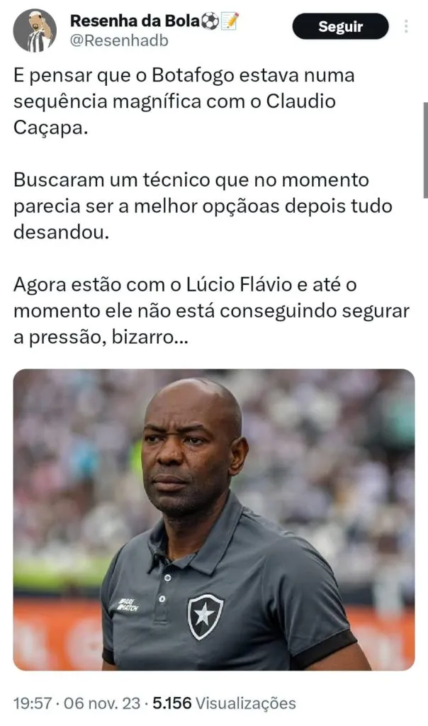 “Se tivessem segurado o técnico talvez não estivessem assim… Não o Bruno Lage, mas Cláudio Caçapa! Continuidade, conhecia bem a equipe, seria heroico um técnico preto campeão brasileiro (o último foi o Andrade em 2009). Agora que ninguém cale esse chororô!”, publicou um torcedor.