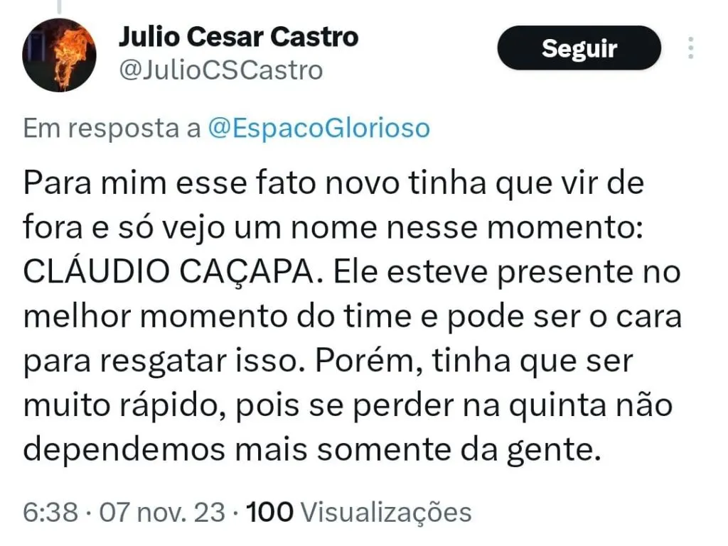 “A verdade é que a diretoria do Botafogo errou em não ter efetivado o Cláudio Caçapa, se o Caçapa ficasse não teria inventado igual o Bruno Lage e o Botafogo teria pelo menos mantido um ritmo de consistência tática e não estaria nessa derrocada psicológica.”, avaliou outro.