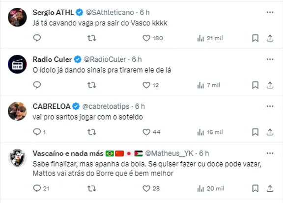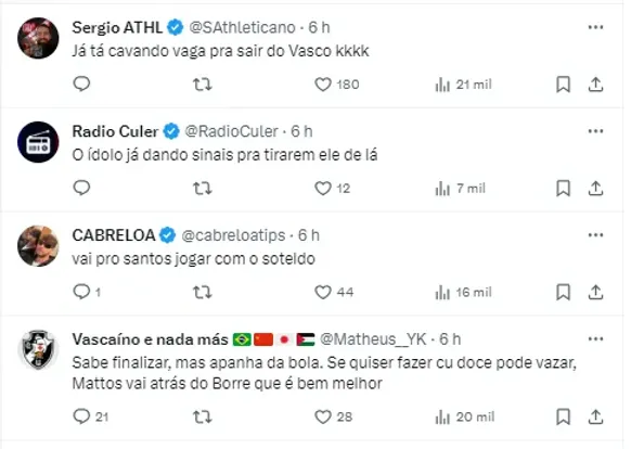 Após a entrevista, a torcida vascaína não gostou nenhum pouco da fala do atacante e comentou nas redes sociais sobre a postura do jogador, que até então era bastante querido pelos cruz-maltinos.