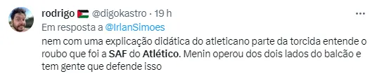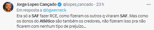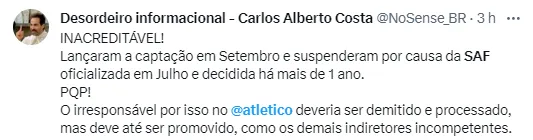 Nas redes sociais, alguns torcedores criticaram a espera em que as decisões do clube têm que ser tomadas, esperando pela SAF. Houve relatos de incompetência, de má gestão e até de roubo por parte da torcida atleticana. Confira abaixo algumas dessas declarações que tem abalado a Web nos últimos dias.