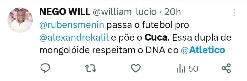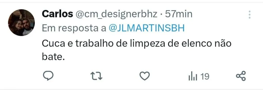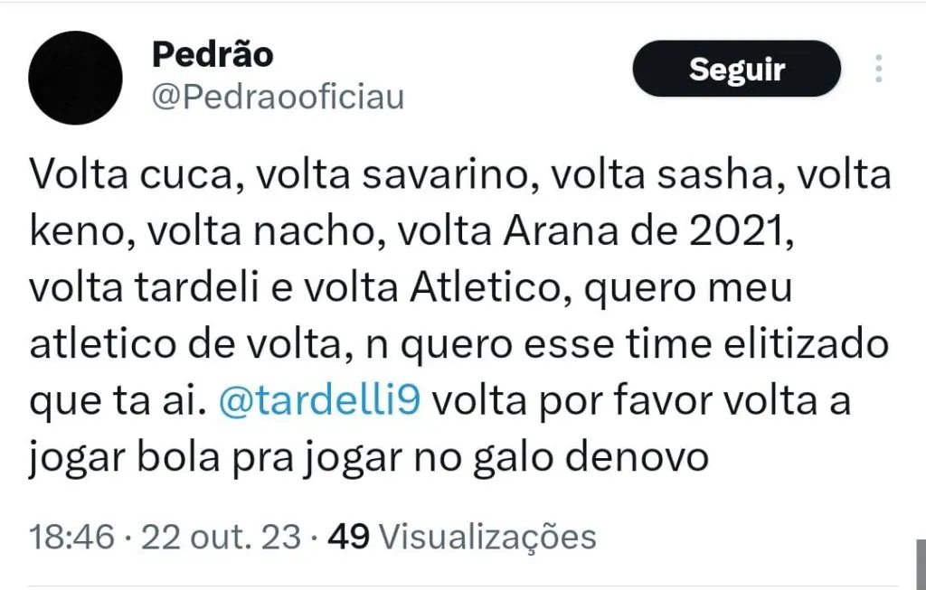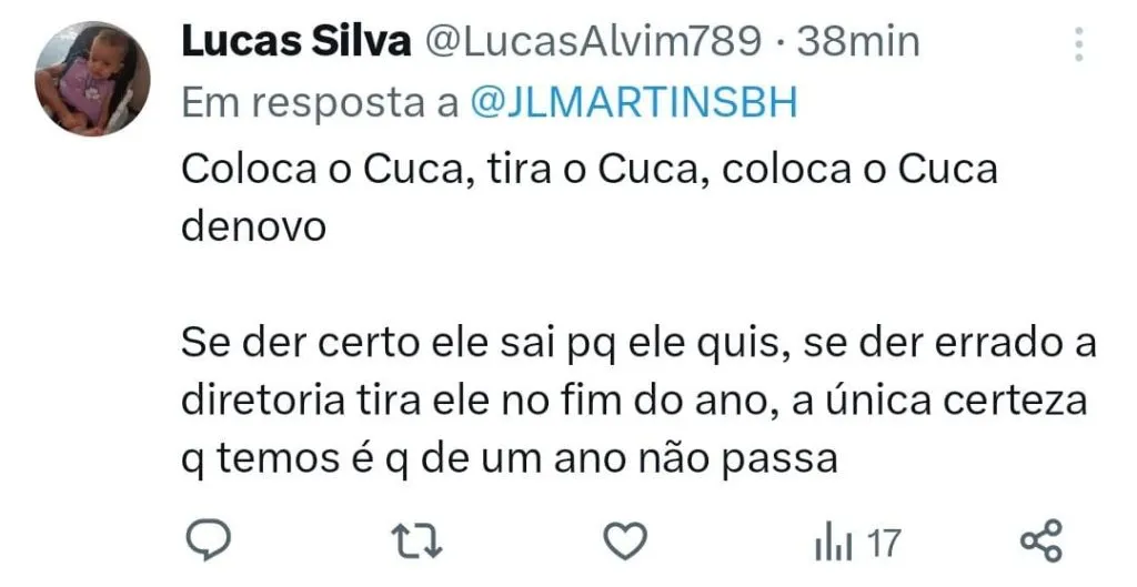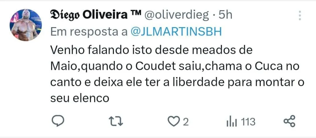 “Vai atras do Cuca e deixa ele fazer o trabalho de limpeza nesse elenco, deixa ele montar o time para 2024, não tem opção no mercado e nem vem com papo de treinador do caso do caralho não… Alexi Stival E se ele quiser da ele a chave do CT.”, escreveu um torcedor no Twitter. “Você é viúva do Cuca? Sou sim, sabe pq? Pq ele tem pau para bater de frente com quem não quer nada no Galo, além de tudo é gestor dentro e fora de campo. Aaaa mas vai viver só de Cuca? Sim, não tem ninguém no mercado e se for atrás de mais um estrangeiro e fracasso certo”, completou.