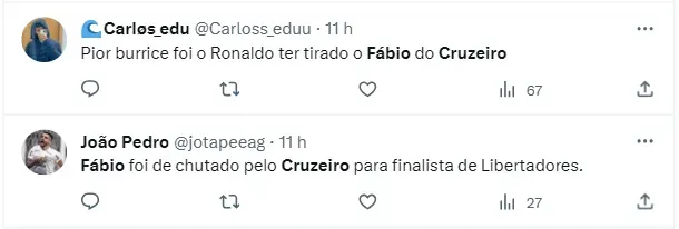 “Esses despeito da torcida do Cruzeiro com o Fábio é feio demais kkk. Inveja pura porque os caras tem como goleiro nosso maior ídolo e a gente tem um mediano pra baixo. Pergunte ai para qualquer Tricolor se chegariam onde estão sem o Fábio e se trocariam o goleiro de 42 anos pelo Cabral”