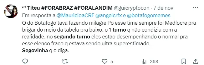 A perda da liderança era inimaginável para o torcedor botafoguense, pois, o Botafogo já chegou a abrir no Campeonato Brasileiro 13 pontos do segundo colocado. Confira abaixo mais reclamações dos botafoguenses quanto ao futebol de Segovinha.