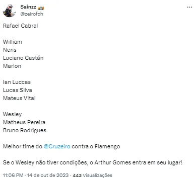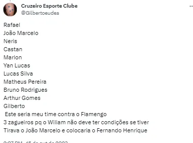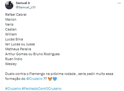 E diante destes retornos importantes, a torcida se manifestou nas redes sociais pedindo uma “escalação ideal” contra a equipe carioca em seus domínios. Muitos foram os pedidos, mas alguns apostaram no ataque formado por Bruno Rodrigues e Wesley, outros já entrariam com Matheus Pereira mais à frente do ataque da equipe: “Rafael Cabral, William, Neris, Luciano Castán, Marlon, Ian Luccas, Lucas Silva, Mateus Vital, Wesley, Matheus Pereira e Bruno Rodrigues; Melhor time do Cruzeiro contra o Flamengo”.