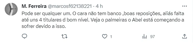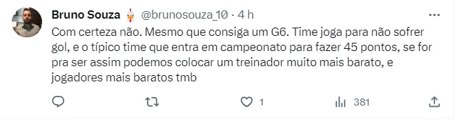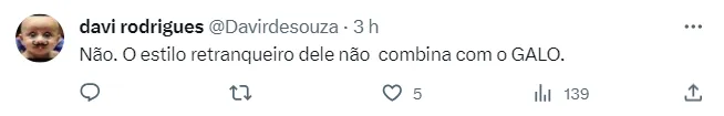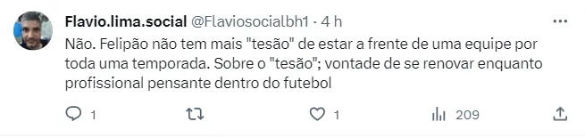 Mas se o contrato de Scolari ainda está longe de encerrar, nas redes sociais os torcedores do Galo já começam a debater se manteriam o treinador para a próxima temporada. As atuações inconstantes do time fazem com que o torcedor tenha um pé atrás na hora de avaliar o trabalho, e as opiniões são praticamente unânimes para não mantê-lo, mas, a responsabilidade também é dividida com os jogadores. Confira os comentários abaixo.
