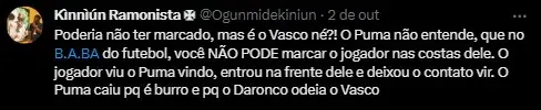 Mas, grande parte da torcida concordou com as palavras do influencer. A atitude de Puma foi inconsequente. Cazé ainda alega que o jogador santista afetado, Marcos Leonardo, estava saindo para fora da área, antes da chegada de Puma, e que a zaga do Vasco ainda teria chance de se defender sem ocasionar um problema maior para o time.