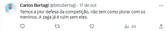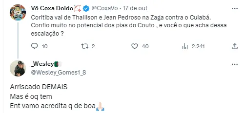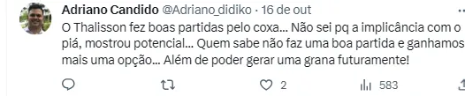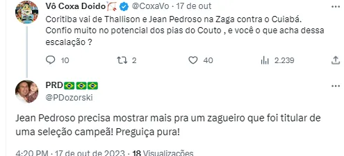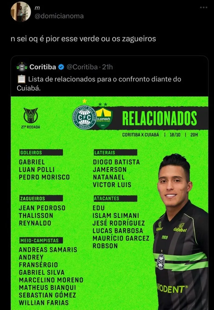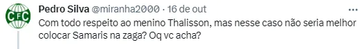 “Não sei o que é pior, esse verde ou os zagueiros!”, “Minha nossa, olha esses zagueiros relacionados”, “Os zagueiros…..”, “Com todo respeito ao menino Thalisson, mas acho que deveria colocar Samaris na zaga”, “Esse Thalisson é bom”, “Thalisson fez boas partidas pelo Coxa, não sei porque a impliccância, mostru potencial, quem sabe não faz uma boa partida e ganhamos uma opção, além de gerar grana futuramente”, publicaram alguns torcedores no Twitter.