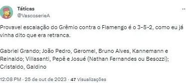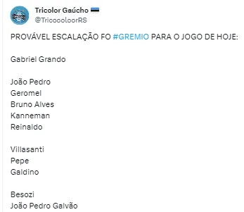 “Provável escalação do Grêmio contra o Flamengo é o 3-5-2, como eu já vinha dito que era retranca. Gabriel Grando; João Pedro, Geromel, Bruno Alves, Kannemann e Reinaldo; Villasanti, Pepê e Josué (Nathan Fernandes ou Besozzi); Cristaldo, Galdino” , “Eu iria de: Grando, João Pedro, Geromel, Bruno Alves, Kannemann, Reinaldo, Pepê, Vilassanti, Cristaldo, Besozzi e Galdino(João Pedro Galvão)” , “Se eu fosse o Renato, eu iria assim contra o Flamengo amanhã: Caique, Geromel, Kannemann, João Pedro e Reinaldo; Villasanti, Cristaldo e Pepê; Ferreira, João Pedro e Besozzi” , “Gabriel Grando; João Pedro, Geromel, Bruno Alves, Kannemann e Reinaldo; Villasanti, Pepê e Galdino; Besozzi e João Pedro Galvão”.