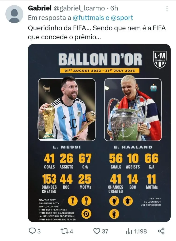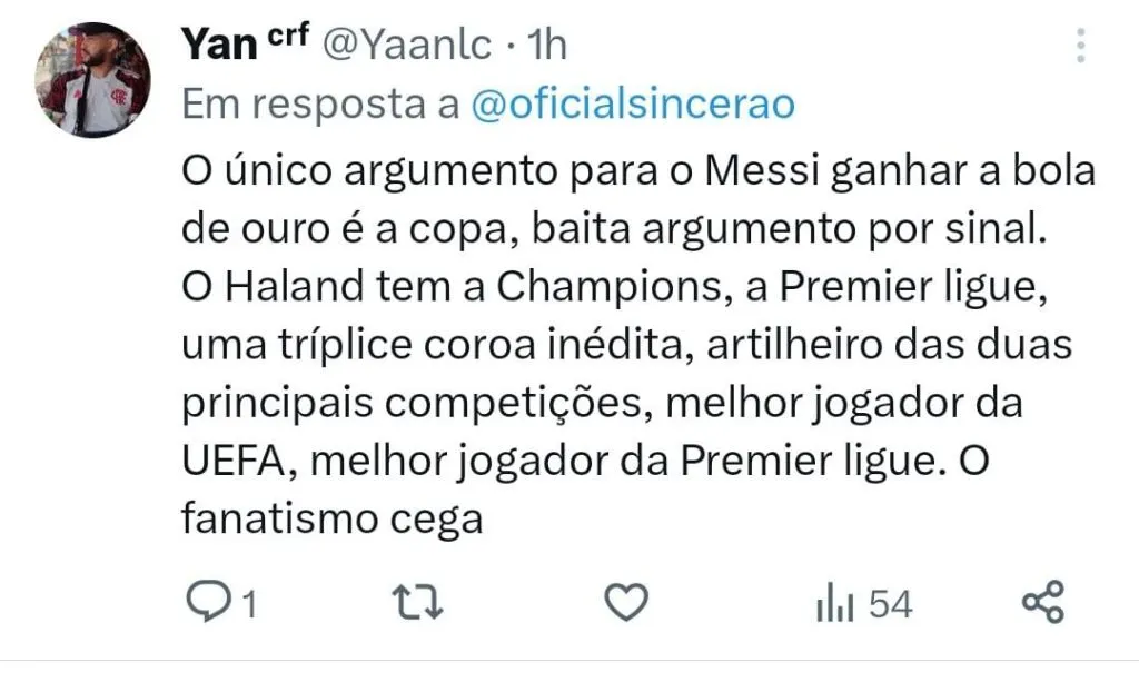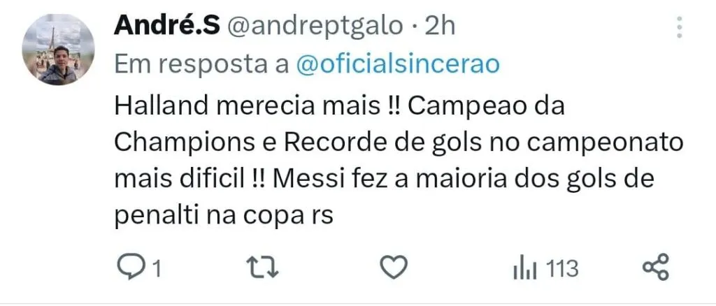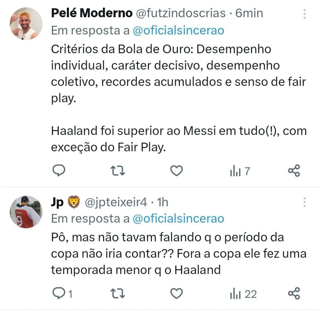 “Haland marcou em 90% dos jogos. Messi ficou metade da temporada AFK. Uma copa do mundo com 5 pênaltis em favor não pode pesar mais que 3 títulos, sendo 2 deles um dos mais importantes da Europa. Isso só estaria em discussão se o Messi tivesse feito uma temporada normal dele.”, completou o mesmo internauta.