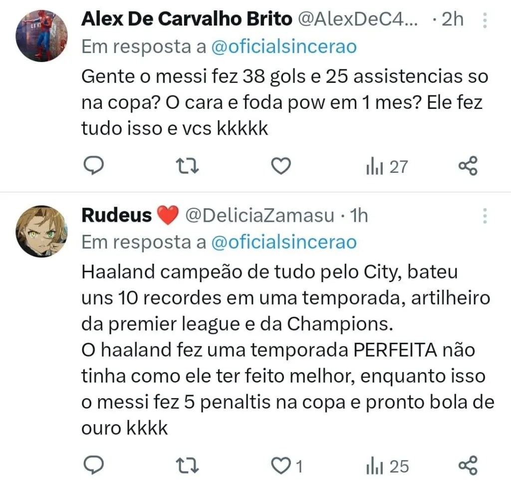 “É Haaland, ou tu faz 200 gols em uma temporada e ganha todos os títulos possíveis no planeta terra ou então se o Messi fizer 1 gol na mls vc nunca ganhara a bola de ouro”, disparou um internauta que foi rebatido: “irmão, prêmio pra goleador já tem artilharia e chuteira de ouro, KDB ta na frente do Haaland pra bola por exemplo, KDB que realmente foi o melhor jogador do city na temporada passada”.